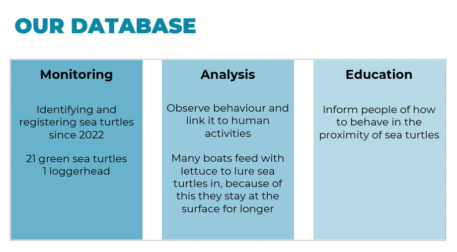 Sightings are recorded as well as additional information like what behaviours they were displaying, if there was human disturbance or if there where multiple turtles that interacted with each other.